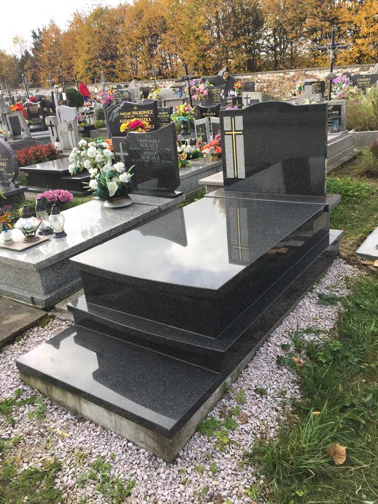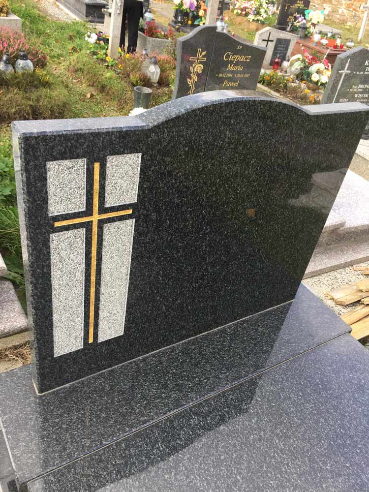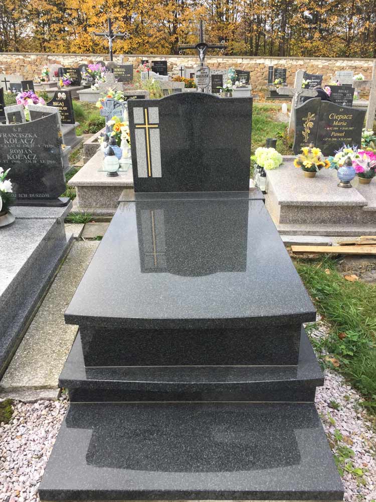 Nagrobek pojedynczy wykonany z granitu Imapla Marikana. Efekt ozdobny wokół krzyża uzyskano poprzez groszkowanie powierzchni granitu.