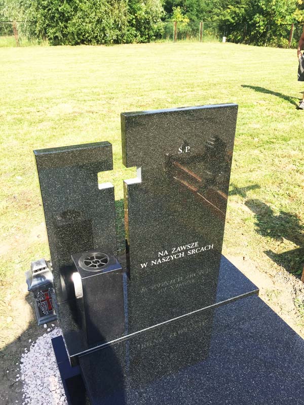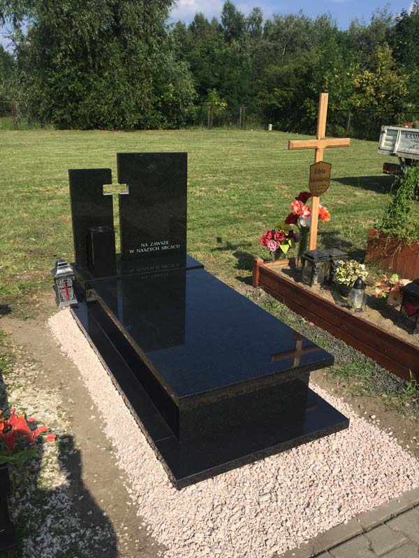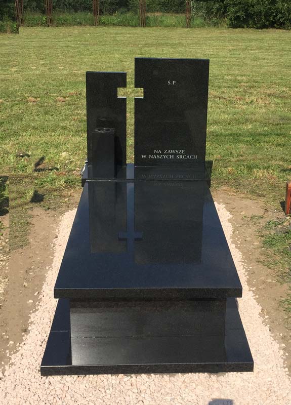Pomnik wykonany z granitu Indian Black z dzieloną w kształcie krzyża attyką oraz wazonem. Dla kontrastu obrzeża nagrobka obsypano białym kamieniem, który doskonale kontrastuje z ciemną barwą granitu co doskonale podkreśla jego strukturę i wyróżnia grób na tle innych.